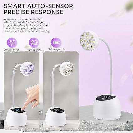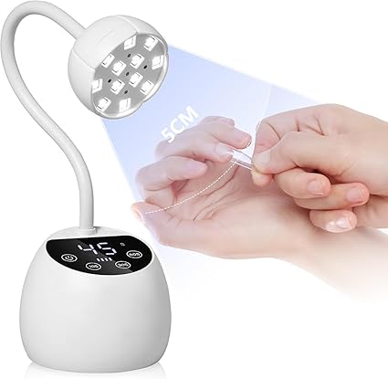 - Smart Infrared Sensor and Dual Light Source: Our small flash cure nail lamp is equipped with smart infrared sensor,Hands/feet near,lamp on.Hands/feet away,lamp off,Note: Please keep hands near to the lamp beads within 5cm/1.96Inch. This LED nail light comes with 12pcs dual light source lamp beads,the light is soft (365+405nm),evenly distributed and delivers a quick and all-directional drying of most UV and LED gel nail polish,such as UV gel,builder gel,magnetic gel,nail extension glue etc.